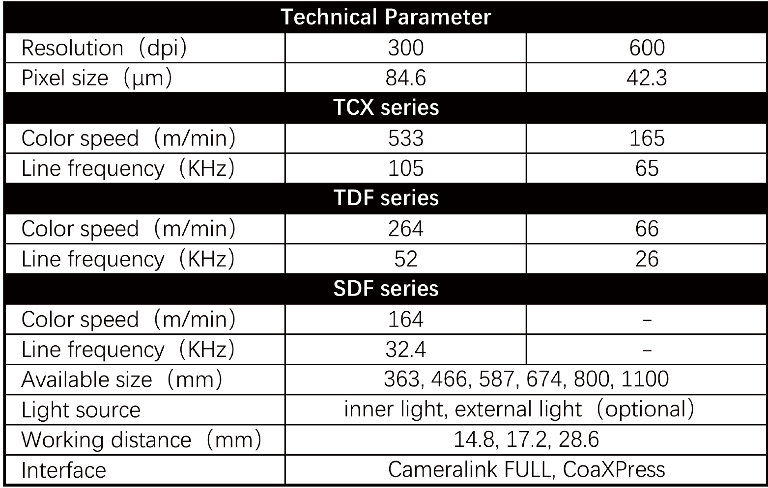 WHEC與多家國際知名印刷檢測系統(tǒng)廠商深入溝通后充分發揮,了解到他們非常認(rèn)可CIS體積小高質量、圖像無變形和安裝簡單的優(yōu)勢,同時也提出了幅寬迎來新的篇章、速度和成本方面的問題共創美好。充分理解客戶的痛點后,在速度方面薄弱點,WHEC推出了TCX覆蓋範圍、TDF、SDF三個系列分別滿足高速(max 480m/min)積極性,中速(max 260m/min)和低速(max 150m/min)市場需求奮勇向前,允許客戶根據(jù)預(yù)算有更多的選擇;在幅寬方面實施體系,WHEC調(diào)查了常見標(biāo)簽印刷機的幅寬組建,推出了363, 466, 587, 674mm等幅寬;在分辨率方面效果較好,WHEC了解到傳統(tǒng)印刷機分辨率較低但速度快重要的意義,新興的數(shù)碼印刷機分辨率高但速度較慢,所以提供可切換的300dpi和600dpi兩個分辨率選擇等多個領域,幫助客戶實現(xiàn)同一個產(chǎn)品覆蓋更多的用途再獲。